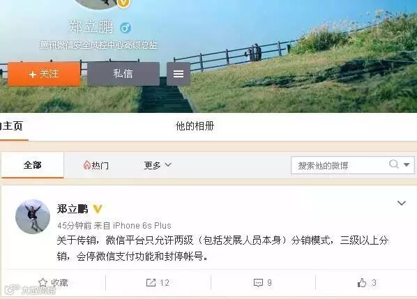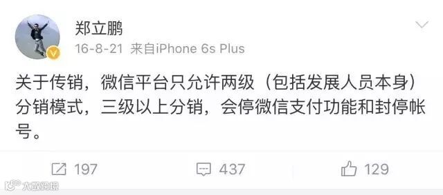 2016年8月,认证为腾讯微信安全风控中心高级总监的郑立鹏发表微博称,“微信平台只允许两级(包括发展人员本身)分销模式,三级以上分销,会停微信支付功能和封停帐号。”