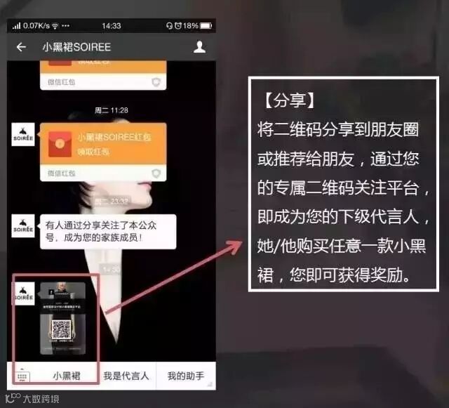 「小黑裙SOIREE」主要的盈利模式是通过分销系统售卖小黑裙,用户购买后会得到一个属于自己的二维码,只要有人扫描你的二维码购买,平台会拿出售价的30%奖励给推广者。以此类推,三级购买关系链内均有奖励。