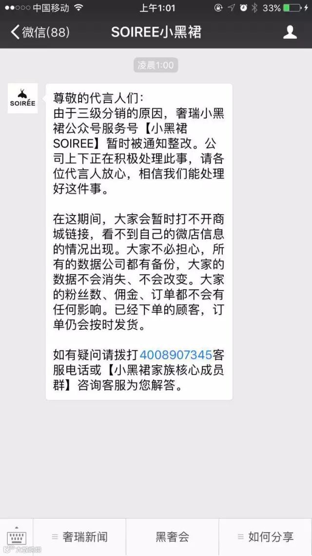 8月1日,小黑裙发布模式变动公告称,“近期我们收到微信方面要求我们进行分销模式调整的通知,出于对微信平台规则的尊重,我们将对SOIREE奢瑞小黑裙共享经济模式进行如下调整,我们在8月1日凌晨起把奢瑞小黑裙三级分销模式调整为一级代言人模式。”