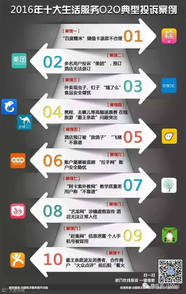 2016年,国内知名第三方电商维权平台“中国电子商务投诉与维权公共服务平台”(http://www.100ec.cn/zt/315/)收到了大量用户对生活服务O2O各平台的投诉。据大数据统计显示,百度糯米储值卡退款不合理、美团预订酒店无法退订、饿了么外卖现虫子、去哪儿高额退票费、预订酒店被飞猪放鸽子、拉手网账户被盗刷、阿卡索外教网不靠谱、艺龙网虚假宣传、赶集网信息泄露,大众点评强制消费入选“2016年度十大生活服务O2O典型投诉案例”。榜单将入选2017年3.15前发布的《2016年度中国电子商务用户体验与投诉监测报告》。