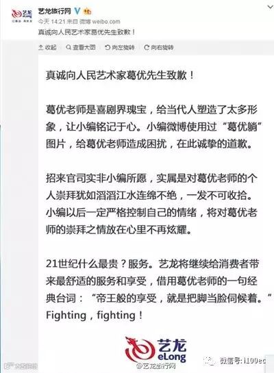 昨日,“艺龙旅行网”实名认证微博发布“真诚向人民艺术家葛优先生致歉!”的文字图片,称“小编微博使用过葛优躺图片,给葛优老师造成困扰,在此诚挚的道歉”。道歉文章的最后一段,仍旧使用了葛优的知名台词“21世纪什么最贵”作为开头,随后继续为艺龙进行宣传。