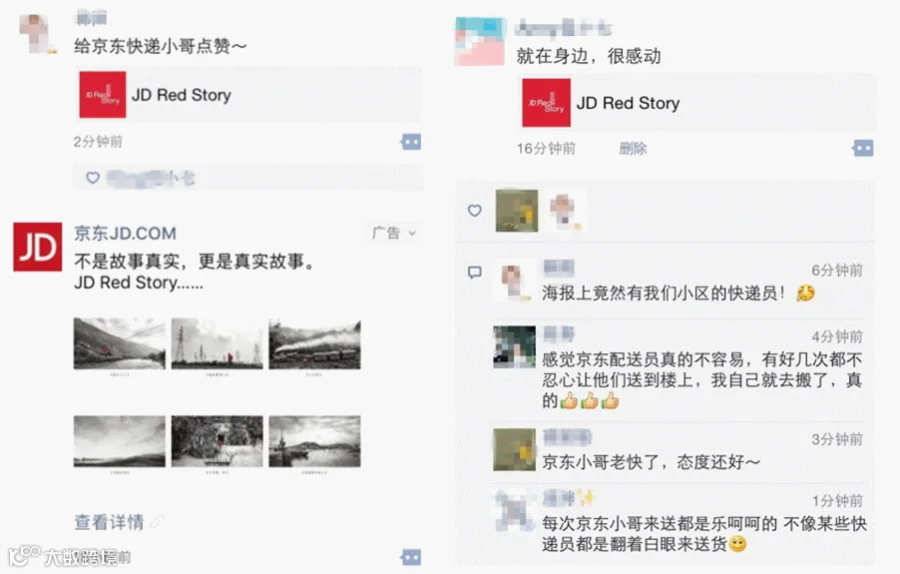 除了出街广告牌,京东《JD Red Story》H5将战火引燃到移动互联,通过真实展示京东快递员故事,引发了人们的好奇和关注,更点燃了人们的同理心,使得京东这支朋友圈广告在图片点击和点赞量上堪称双十一电商行业最高。