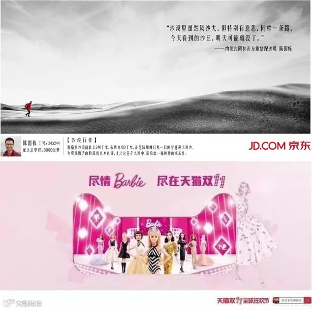 京东在双十一来临前,推出了一系列 “红的故事”海报,在全国重要城市的地铁站、机场进行投放。海报挑选了10位配送员作为主角,既有北京的胡同小哥,也有四川的火车侠,还有沿海地区的水手。而难能可贵的是,海报中这些配送员跋山涉水的故事,都100%源于生活,100%真实。