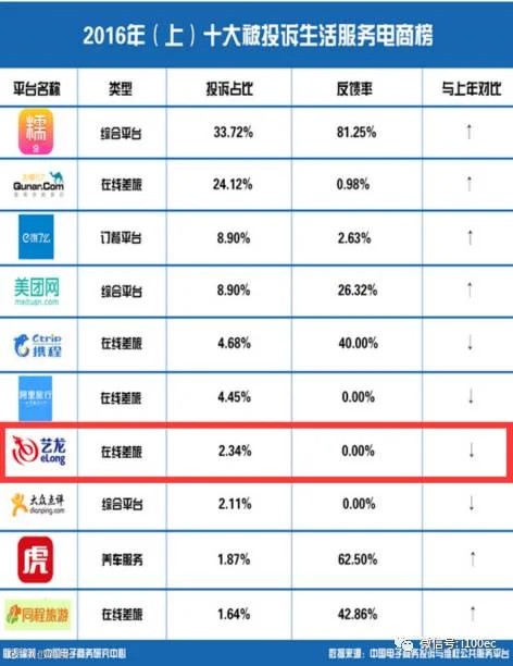 报告通过“中国电子商务投诉与维权公共服务平台”受理的海量投诉案例与大数据监测显示:在线差旅平台艺龙网在全国生活服务电商的投诉占比为2.34%,位列2016上半年十大生活服务电商投诉榜第七位。