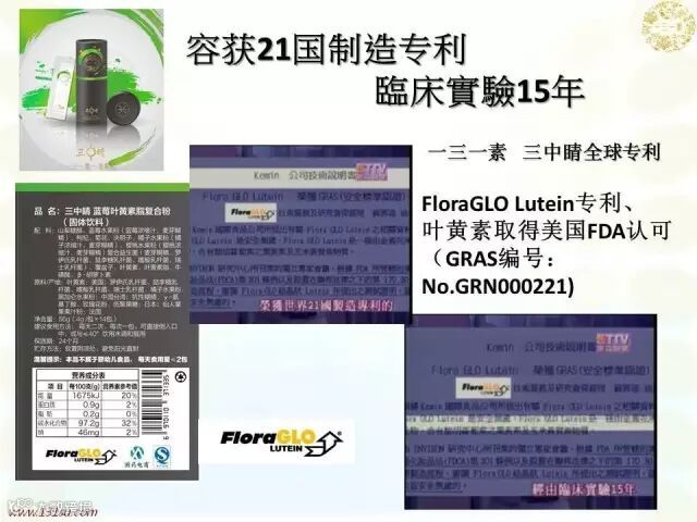 全世界有一个公司叫做美国的komln公司目前取得一个全球的专利,可以让叶黄素在短时间让肠道进行吸收!那么目前我们一三一素三中睛与美国komln公司进行合作取得这个21国的制造专利,临床实验超过十五年,那么这个专利呢,取得美国FDA的认证(GRAS编号:NO.GRN000221),都可以在网络上查到的这个证,那么我们就可以证明三中睛为什么饿能够在短的45分钟内,马上将你的眼球进行修护!同时视力在这么短时间内有所改善,这就是因为我们科技的专利!