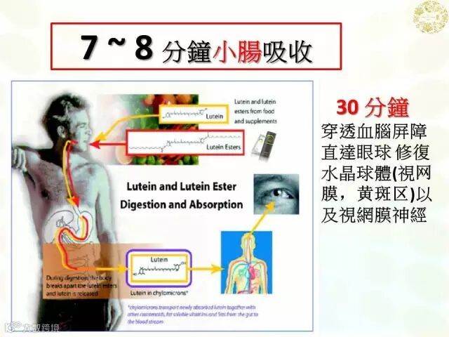 那么发现通过这些所有的技术在合成的时候,很多人在服用之后,在临床上面证明在八分钟左右已经可以在小肠跟血液里面提取到叶黄素的一个成分,证明这个产品在八分钟左右小肠已经可以完全吸收,在三十分钟左右可以穿透头部血脑屏障的一个障碍物质,然后直达眼球修护水晶球体!包括视网膜黄斑区以及视网膜的整个神经细胞组织,那这个部分是眼睛球体里面最重要的物质,如果能够进行修复来讲,超过百分之八十的人视力都会逐渐恢复到正常状态!