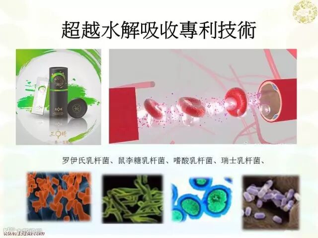 结合了一个超越水解吸收专利技术,可以将三中睛有效成分进行水解!也就是我们的产品可以放到水里面你可以发现在短短几秒钟之内,跟水可以彻底融合!