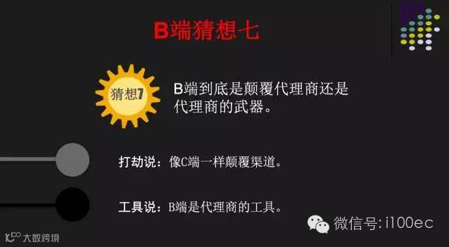 第七个猜想就是我们B端的角色到底是什么,我们是要把经销商干掉我们成为经销商,还是我们自己帮经销商?