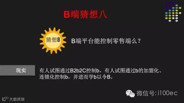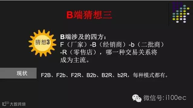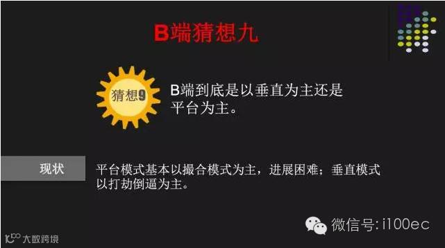 第九个猜想就是B端到底是以垂直为主还是平台为主。我们自营的基本上是垂直的。垂直的意味着你就成了一个和现有经销商竞争的新经销商。同样你以B端的平台为主,成本不一定是具备的,所以这是两者之间怎么平衡的问题。