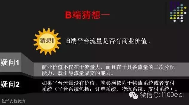 第一个猜想是什么呢?B端电商到底是不是电商。我觉得上半年没有人怀疑这个,换种说法,B端电商的流量是否具备商业价值。