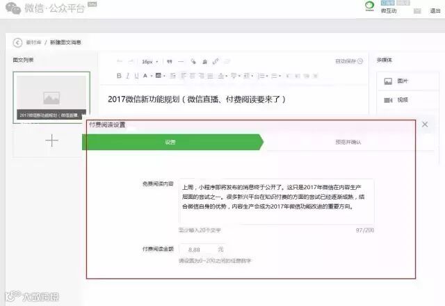2)公众号运营者可以设置单篇文章免费阅读的字数,但需在200字以内,读者想要阅读全文就要付费,付费金额在0到200元之间。