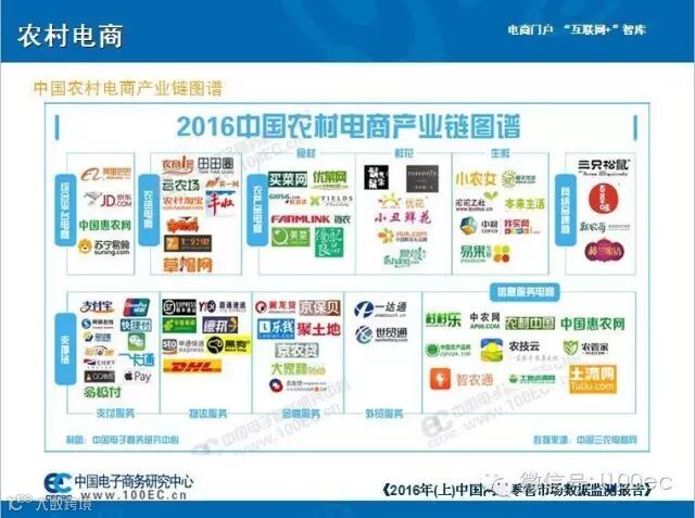 据中国三农电商网(www.100ec.cn/zt/sndsh)企业数据库监测显示,农村市场成为电商战略发展的新重地。目前农村电商市场包括:1)平台电商:阿里、京东、苏宁等;2)品牌电商:三只松鼠、百草味、新农哥、褚橙、獐子岛、胡须先生等;3)B2B电商:云农场、农商1号、生意宝、一亩田、链农等;4)O2O电商:小农女、美菜、优配良品、田田圈等。