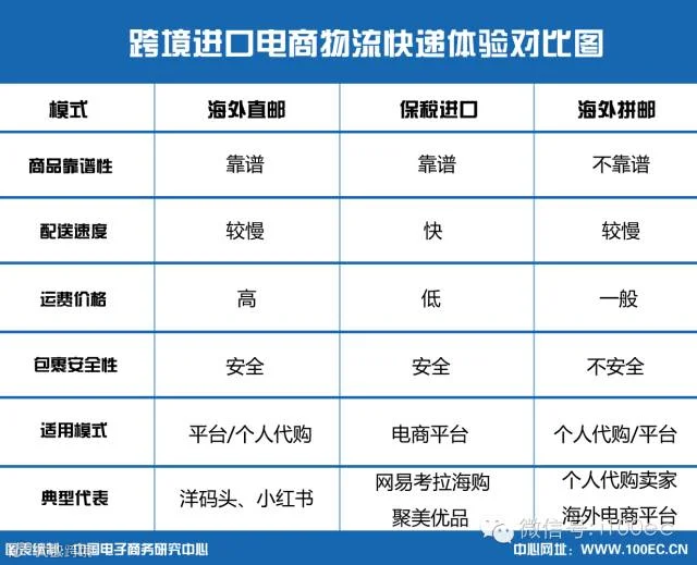 中国电子商务研究中心法律权益部分析师姚建芳表示,目前跨境网购配送主要有海外直邮、海外拼邮、保税进口三种模式,以下为中国电子商务研究中心整理的跨境进口电商物流体验对比图。