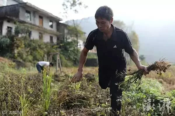 傍晚时分,环绕严辉村四周青山上的云雾总算完全褪去。范家发拄着木质的拐杖,一瘸一拐地跟随在妻子的身后,妻子挑着一个用来装花生的人字形担架,夫妻俩一前一后走在田埂上。地里的花生成熟了,范家发和妻子分头把花生带苗拔出,甩掉花生上带的泥土,又配合着装进担架中,动作配合默契又娴熟。范家发说,不管二儿子范小勤会不会继续走红,是不是会受到好心人的帮助,生活还是照样要继续。