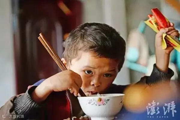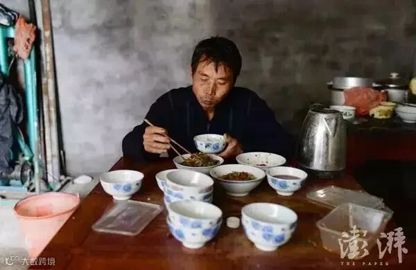 “小马云”范小勤在家中吃午饭,他手里捏着一包爱心人士给他买的瓜子
