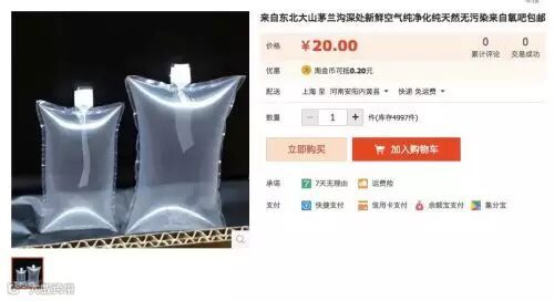 相较而言,国内的空气价格要便宜许多,一个为名“来自东北大山茅兰沟深处新鲜空气”的售价只有20元,采用的是袋装,也没有标注容量。