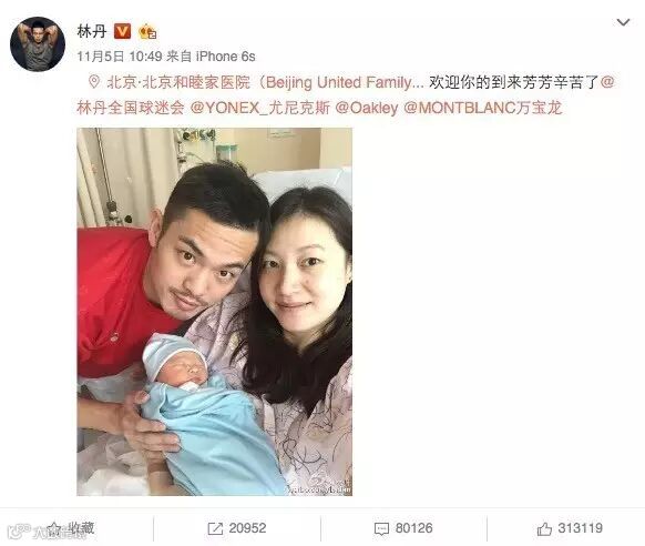 11月5日,林丹在微博上发出一张照片,图中谢杏芳抱着刚出生的孩子,林丹抱着谢杏芳,一家三口其乐融融。现在这条微博已经被网友攻陷,成为近三个月来评论最多的一条微博。