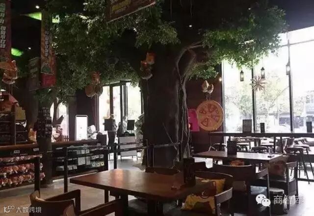 店内装修风格包括货架、装饰品在内均以森林主题为主,店内还有1/3的区域设置了休闲座椅和吧台,还放置了大树、木屋等充满森林气息的元素。