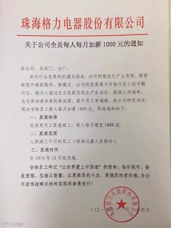 24日晚间,一则署名为珠海格力电器股份有限公司的《关于公司全员每人每月加薪1000元的通知》开始在网上流传。