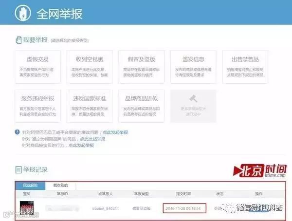 11月28日,“北京时间”在淘宝官方的举报页面以“假冒及盗版”的理由对“小贝美妆”进行举报,根据淘宝规定,以“假冒及盗用(版)”为理由进行的举报, 处理时长为5个工作日之内。