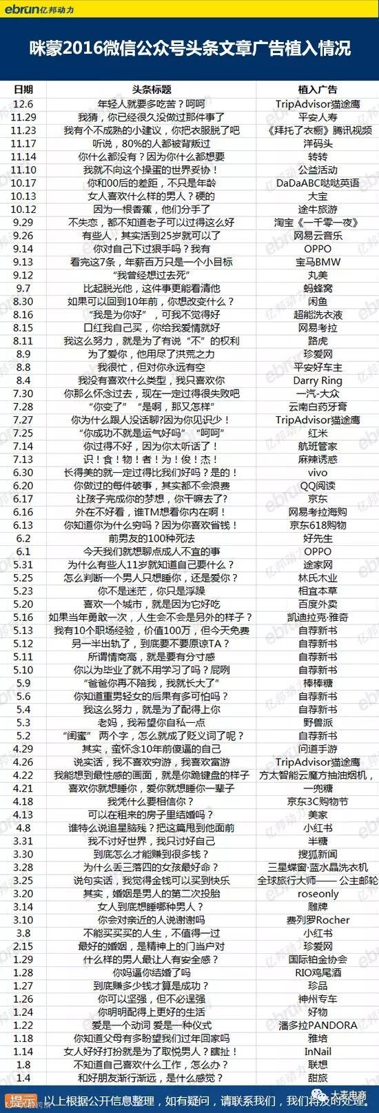 媒体发现,截至12月6日,咪蒙2016年共发布了239篇微信公众号头条文章,其中有75篇植入了广告,占比31.4%。另外,累计出现59家品牌商,OPPO、TripAdvisor猫途鹰、京东、网易考拉海购、小红书、珍爱网等6个品牌多次植入广告。植入最多的是TripAdvisor猫途鹰和京东,均出现三次。