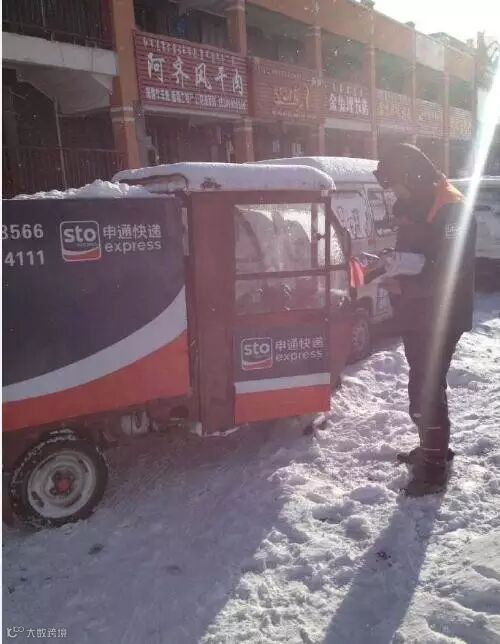 天气再恶劣还是坚持在路上的快递员。