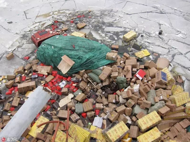 哈尔滨:卡车坠冰河 司机逃生20吨快递“打水漂”
