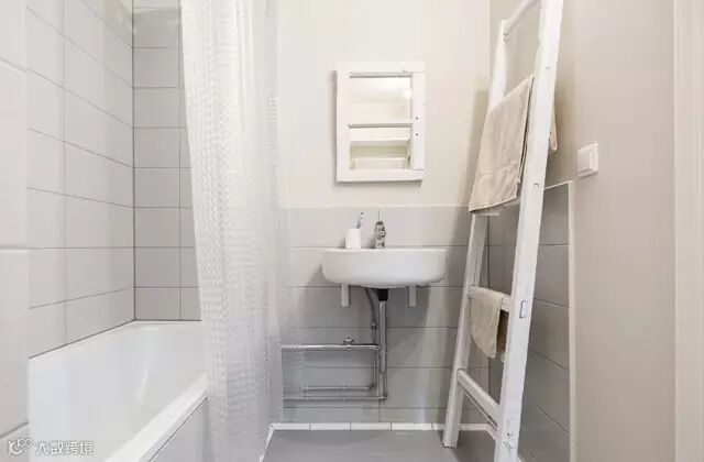 浴室置物架是由旧木梯重新刷白再利用,整个卫浴间以白色为主色调,看上去洁净清爽,这些旧物合理利用以后,又让空间多了些怀旧情调。