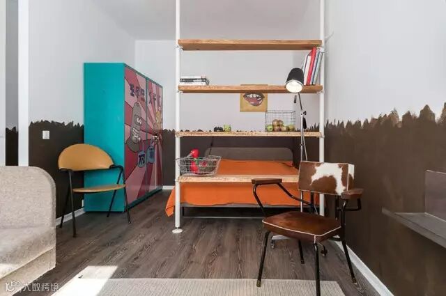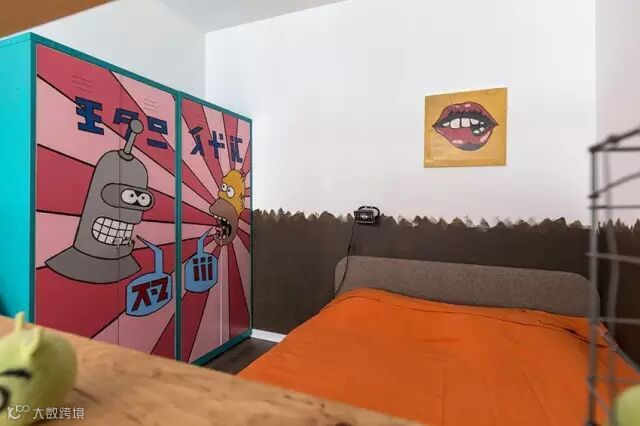 卧室大床旁边的衣柜很有特色,是业主从旧货市场淘来两个大铁皮柜,把它们并起来以后放在床边,图案逼真又可爱的卡通图案衣柜,给整个家居增加了活泼气质,而且主人通过自己的手绘画展示才艺,让家居气息因此变得可爱温馨。