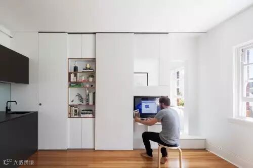 有需要的时候,业主还可以从橱柜墙内抽出桌板配件,让公共空间变身工作室。