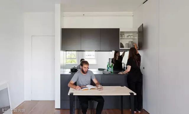 收纳柜的后面隐藏了小厨房和淋浴室,巧妙的设计让居室看起来整洁一新。