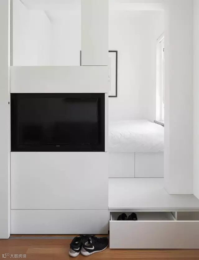 卧室地面被抬升了一个台阶,建筑师如此设计,是为了将台阶设计成抽屉式鞋柜,将收纳功能发挥到极致。