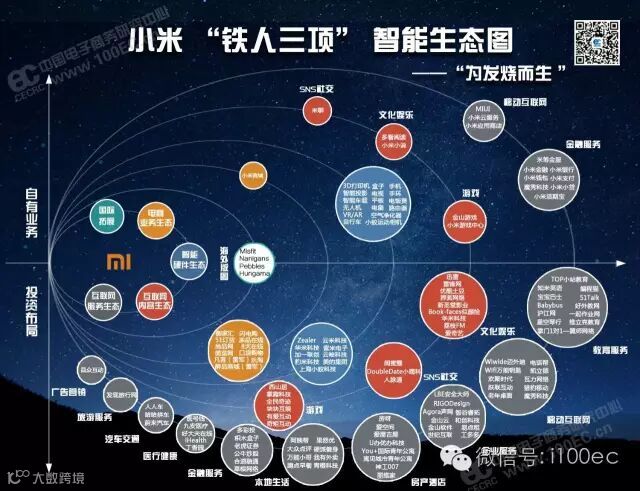 “为发烧而生”的小米“铁人三项”智能生态图分为电商业务生态、智能硬件生态、互联网内容生态、互联网服务生态、国际拓展五部分展开。