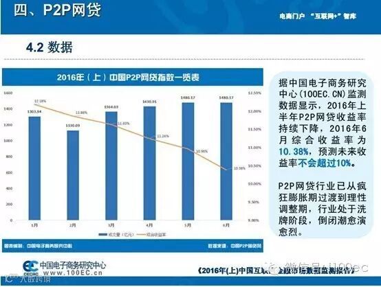 据中国电子商务研究中心(100EC.CN)监测数据显示,2016年上半年P2P网贷收益率持续下降,2016年6月综合收益率为10.38%,预测未来收益率不会超过10%。