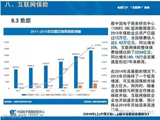 据中国电子商务研究中心(100EC.CN)监测数据显示,2015年保险业总资产已超过12万亿,全国保费收入达2.43万亿元,同比增长20%,互联网保险整体保费规模达到了2234亿元,同比增长160.1%,行业发展速度创近7年来新高。