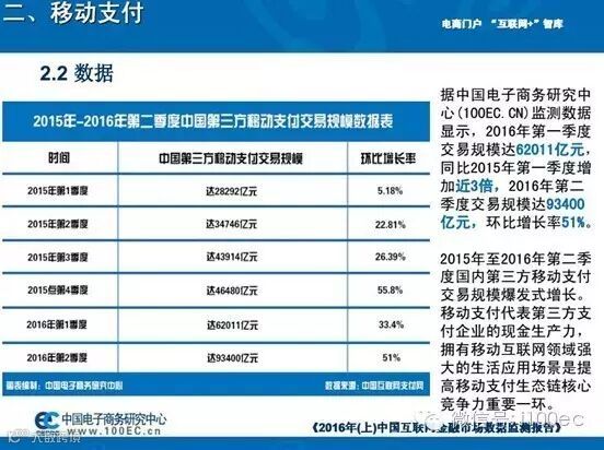 导读: 9月26日,电商门户、互联网+智库——中国电子商务研究中心(100EC.CN)发布了《2016年(上)中国互联网金融市场数据监测报告》(全文下载:http://www.100ec.cn/zt/upload_data/2016hlwjr.pdf)。报告报告发布了2016年上半年中国互联网金融行业及各细分市场规模及发展现状、趋势,包括移动支付、互联网+银行、P2P网贷、众筹、消费金融、互联网理财、互联网保险、在线供应链金融、征信等,以下为报告摘选。