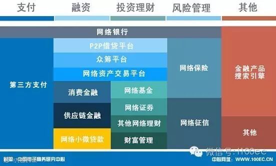 中国互联网金融业态主要由第三方支付、P2P借贷平台、众筹平台、网络资产交易平台、消费金融、供应链金融、网络小微贷款、网络基金、网络证券、其他网络理财、财富管理、网络保险、网络征信、金融产品搜索引擎及其他金融业态组成。