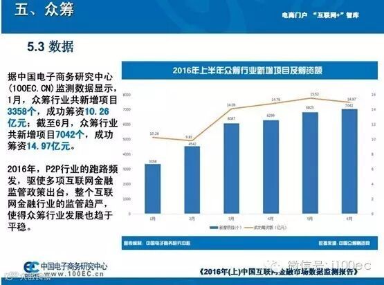 据中国电子商务研究中心(100EC.CN)监测数据显示,1月,众筹行业共新增项目3358个,成功筹资10.26亿元;截至6月,众筹行业共新增项目7042个,成功筹资14.97亿元。