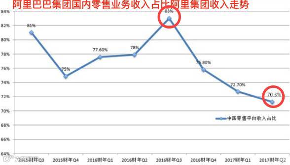 但是通过下面的两组图看,当下,阿里零售业务的占比正在发生变化:逐渐减少。从最高83%下降到70%多左右。这说明了什么呢?有一方占比减少就有另外一方占比增加,增加的是哪部分呢?