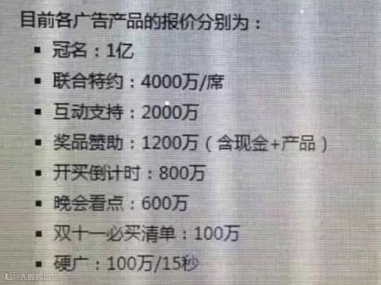 据Jassica(国内一家户外运动品牌的电商总经理)提供的一份未经过天猫认证的双11晚会广告报价来看,双11晚会涵盖了冠名、联合特约、互动支持、奖品赞助、开买倒计时、晚会看点、硬广等多种上午合作方式,报价从几百万到一个亿不等。