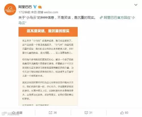 阿里巴巴官方明确表示,网上关于“小马云”的各种信息,这不应该是一个笑话或者段子,“小马云”的背后是沉重的现实:我们社会还有那么多未脱贫人群,乡村留守儿童的教育、成长问题,让人深思和焦心。