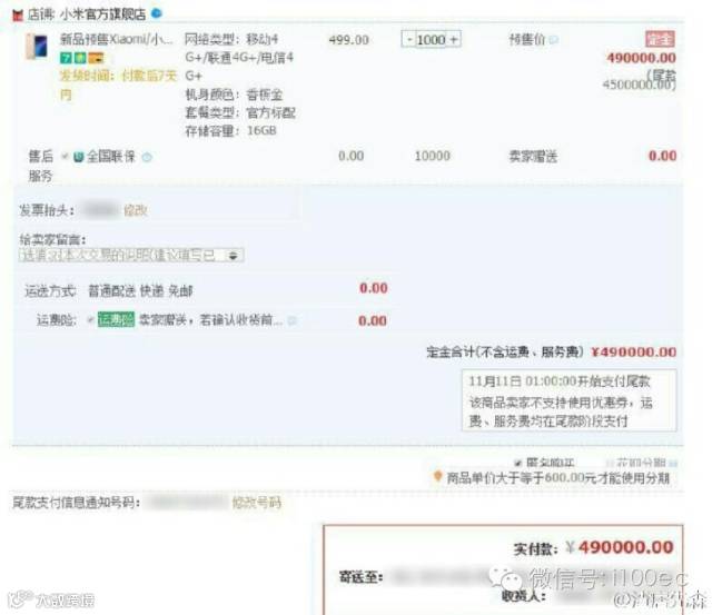 根据该网友在微博发布的视频,消费者在小米旗舰店购买价值1199元的红米note4手机,将购买数量设置为7000,仍能继续操作,页面可直接跳转到提交订单环节。