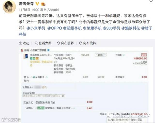 11月5日,微博网友@渣痞先森发文质疑小米,称后者在2016年双11预售期存刷单嫌疑。具体表现为小米手机在参与天猫双11预售时,并未遵照限购规则,出现了能够一次性下单10000台的状况。