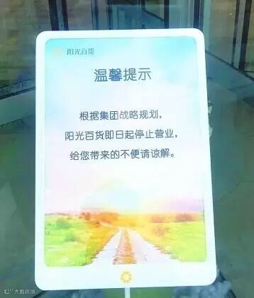 其实早在7月27日,就传出了阳光百货将在8月停业的消息。虽然有负责人立即辟谣,但28日阳光百货还是发出了将停业的公告。公告称商场停业的原因是“战略规划”,并介绍了有关会员卡、购物卡的处理办法。公告中也明确表示,阳光百货停止营业的时间是8月28日。