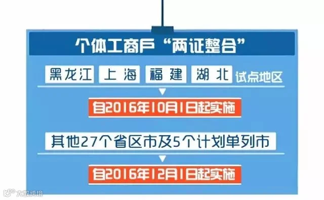 《意见》明确,黑龙江、上海、福建、湖北作为试点地区自2016年10月1日起实施个体工商户“两证整合”,其他27个省(自治区、直辖市)及5个计划单列市自2016年12月1日起实施。