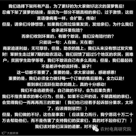 这个事情也是醉了,居然为了"助农"(无法判断是真助农还是伪助农,故加上了引号)把自己店弄倒闭了[利益相关:有亲友买了他家的水果送我,告诉我不能发货了,然后我就看到店铺首页各种道歉声泪俱下,水果全部下架,消费者很多都评价说收到了不同程度的坏菠萝。