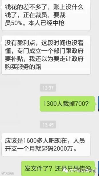 综合各种消息判断,胡球得出以下结论:1、钱烧的差不多了,以调岗和待岗为名义的变相裁员50%,800人的消息相当可信,就在节后的这一周进行!省了年底双薪呀,相当于省了2000万!