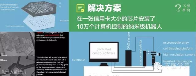 今天的做法有两种,一种是通过物理方法,加到1000伏的电压,对一批细胞做改造,这样的问题是细胞的存活率非常低;另外一种是提供化学方法,通过显微镜上对每一个细胞注入病毒做改变,这样一个一个细胞的改变效率是非常低的。而我们的解决方案是,在一张芯片上集成了10万个纳米级的机器人,每一个都是个性化的基因治疗体系。所以我们的项目让个性化基因治疗和基因新药的效率提高了10万倍。
