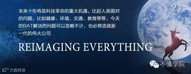在我看来,今天移动互联网流量之争已经基本大局已定,已经进入收官阶段。可是大家想过没有,万物互联大大地延伸了人类的触角,人工智能大大提高人类对世界的理解,虚拟现实让现实世界与虚拟世界无缝融合。这三大驱动力使我们正处在一场史无前例的科技革命的风暴前沿。这场科技革命可能会彻底改变我们对健康、对交通、对教育、对赖以生存的地球生态环境等这些人类急需解决的重大问题的答案。50年之后,人类寿命可能会达到270岁。针对人类面临的问题,BAT解决的问题实在太渺小了。我们为什么要担心BAT,颠覆BAT呢?十年后BAT或许就只是微不足道的小公司。这就是我们今天面临的机会。