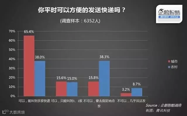 这一结果与城市用户之间的差异很大。81%的城市用户表示可以方便的发快递,其中65.4%的用户则可以叫到多家快递上门。